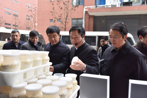 市委書記孫云飛(左三)、市政協(xié)主席王勝(左二)、市委常委常務(wù)副市長(zhǎng)付新安(右一)、金寨縣縣長(zhǎng)汪冬(左一)觀看菌瓶