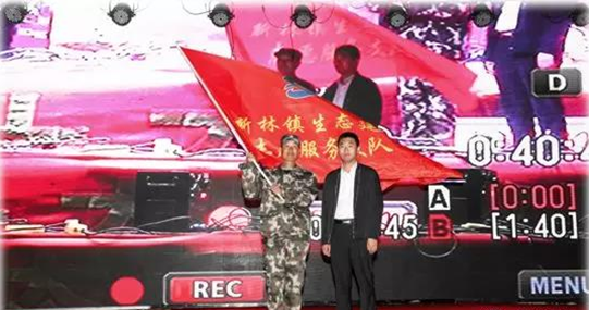 趙慧武鎮(zhèn)長向“蘇人牧場”授旗(“新林鎮(zhèn)生態(tài)建設(shè)志愿服務(wù)大隊(duì)”)
