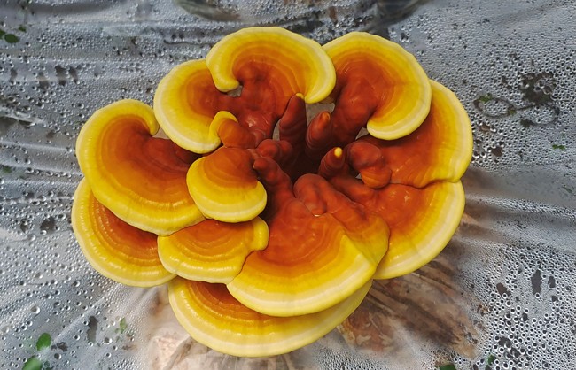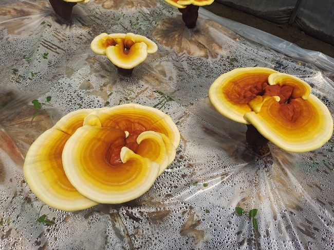 非??上驳氖?,錦華今年種植的200多畝有機(jī)靈芝獲得大面積豐收,有部分靈芝已經(jīng)開(kāi)始噴孢子粉了。